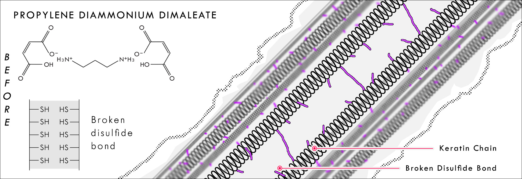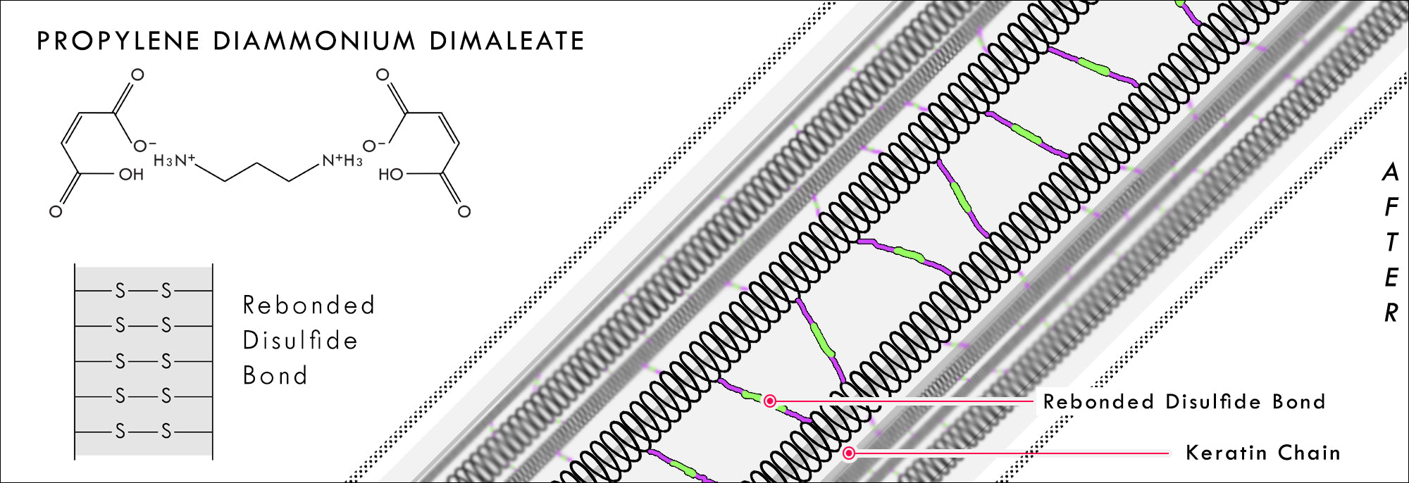 El dimaleato de cistamina agrega un enlace disulfuro adicional, lo que resulta en una reparación mejorada a través de enlaces más fuertes, lo que permite un mayor tono de decoloración y produce resultados de color más vibrantes.
